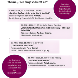 Alle Interessierten sind herzlich eingeladen, eine, mehrere oder alle vier Fastenpredigten zu hören und jeweils im Anschluss den Gottesdienst (ohne Predigt) mitzufeiern; danach sind alle zu einem warmen Getränk eingeladen und haben die Möglichkeit, die Fastenprediger*innen persönlich zu treffen und sich über die Beiträge auszutauschen.