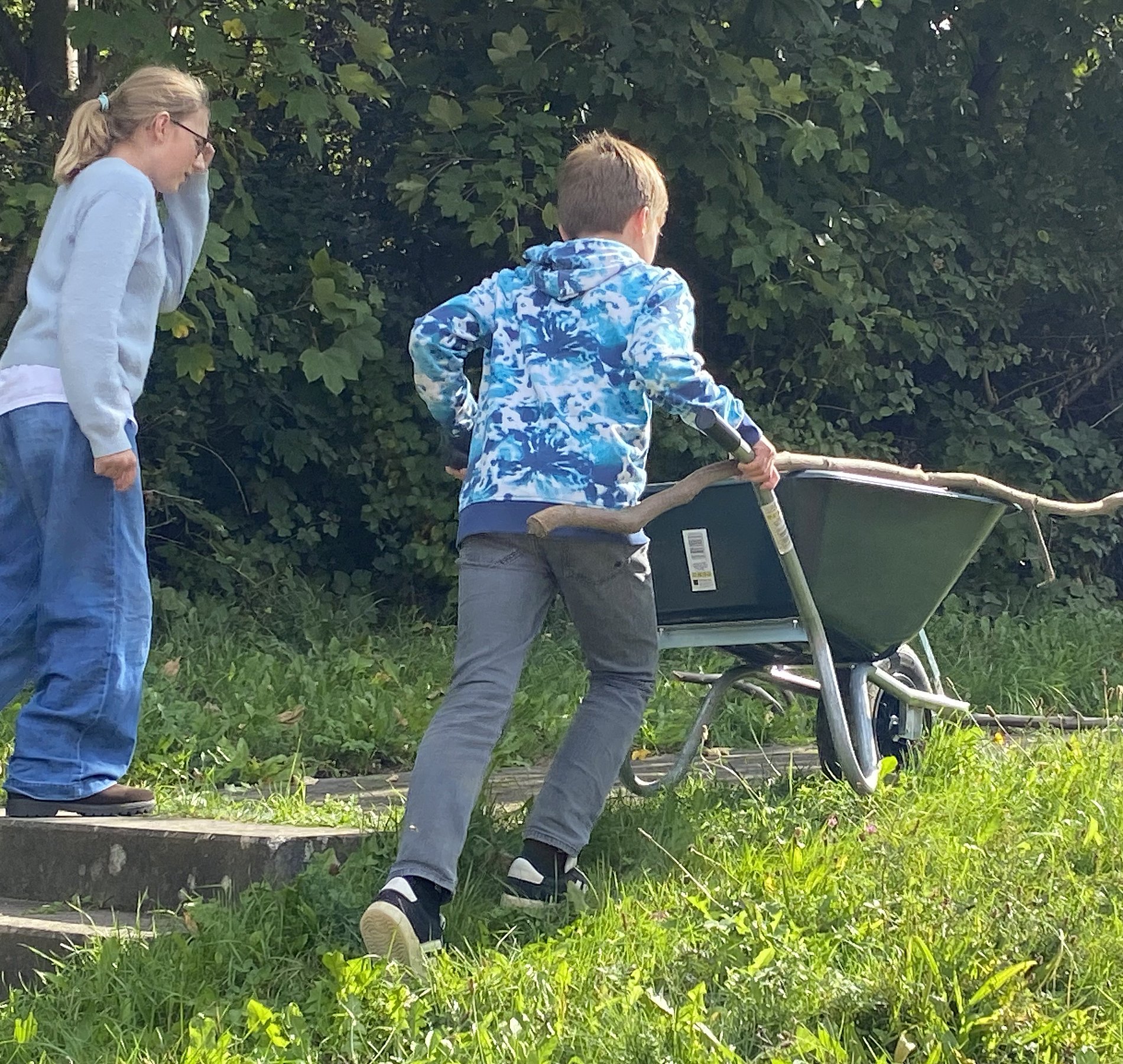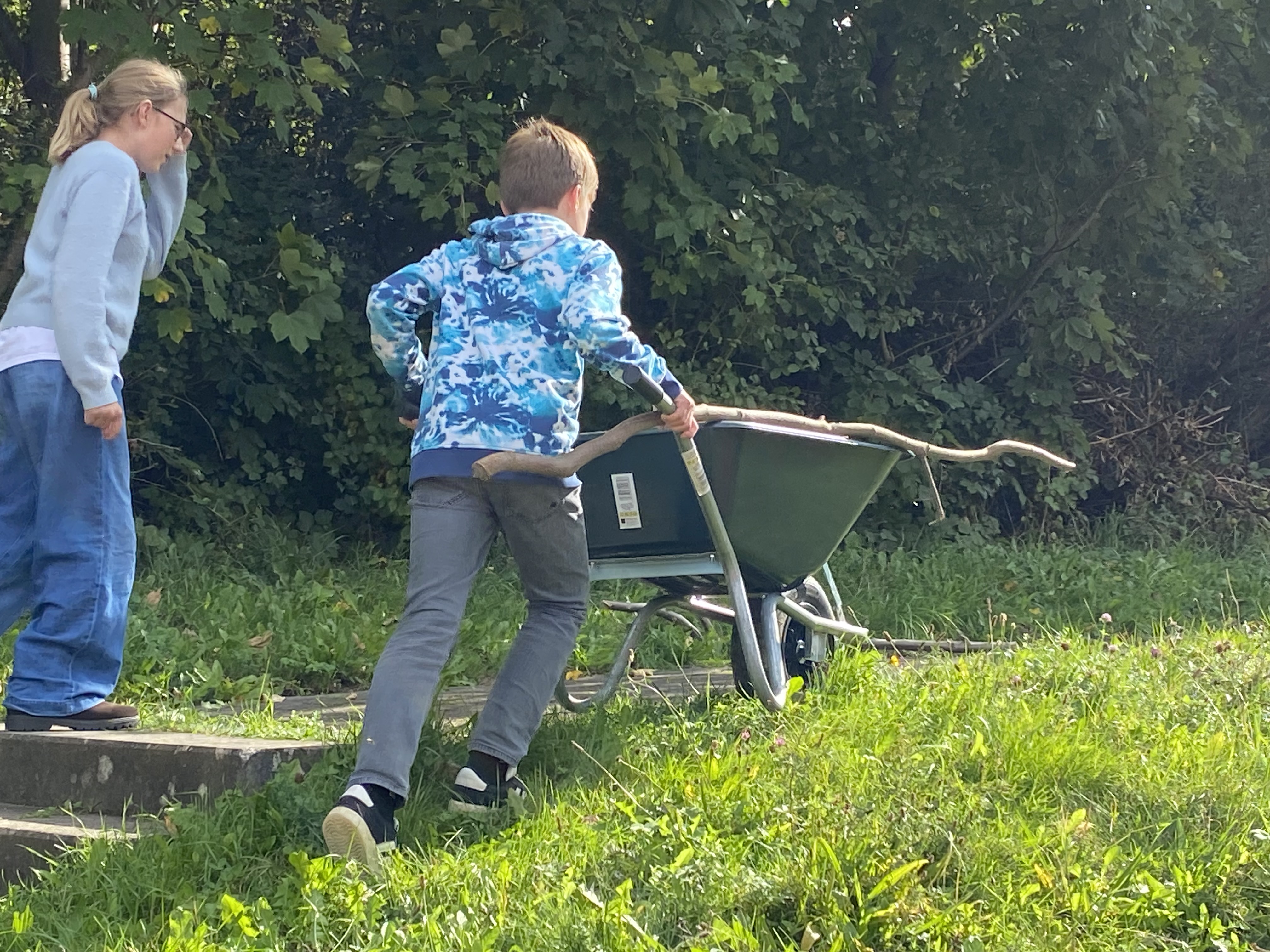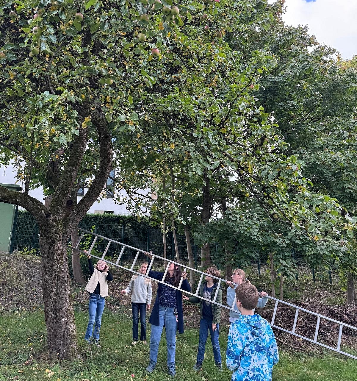 „Von fünf Apfelbäumen sind nun drei übrig, die anderen mussten einer Baumaßnahme weichen. Dafür trugen die drei alten Apfelbäume sehr viele Früchte, allerdings teilweise in schwindelerregender Höhe. So war guter Rat teuer, das Schütteln der Bäume und das Pflücken mit dem Obstpflücker mussten gut koordiniert und beaufsichtigt werden“, so Dr. Antje Bauke-Poree (Garten-AG).