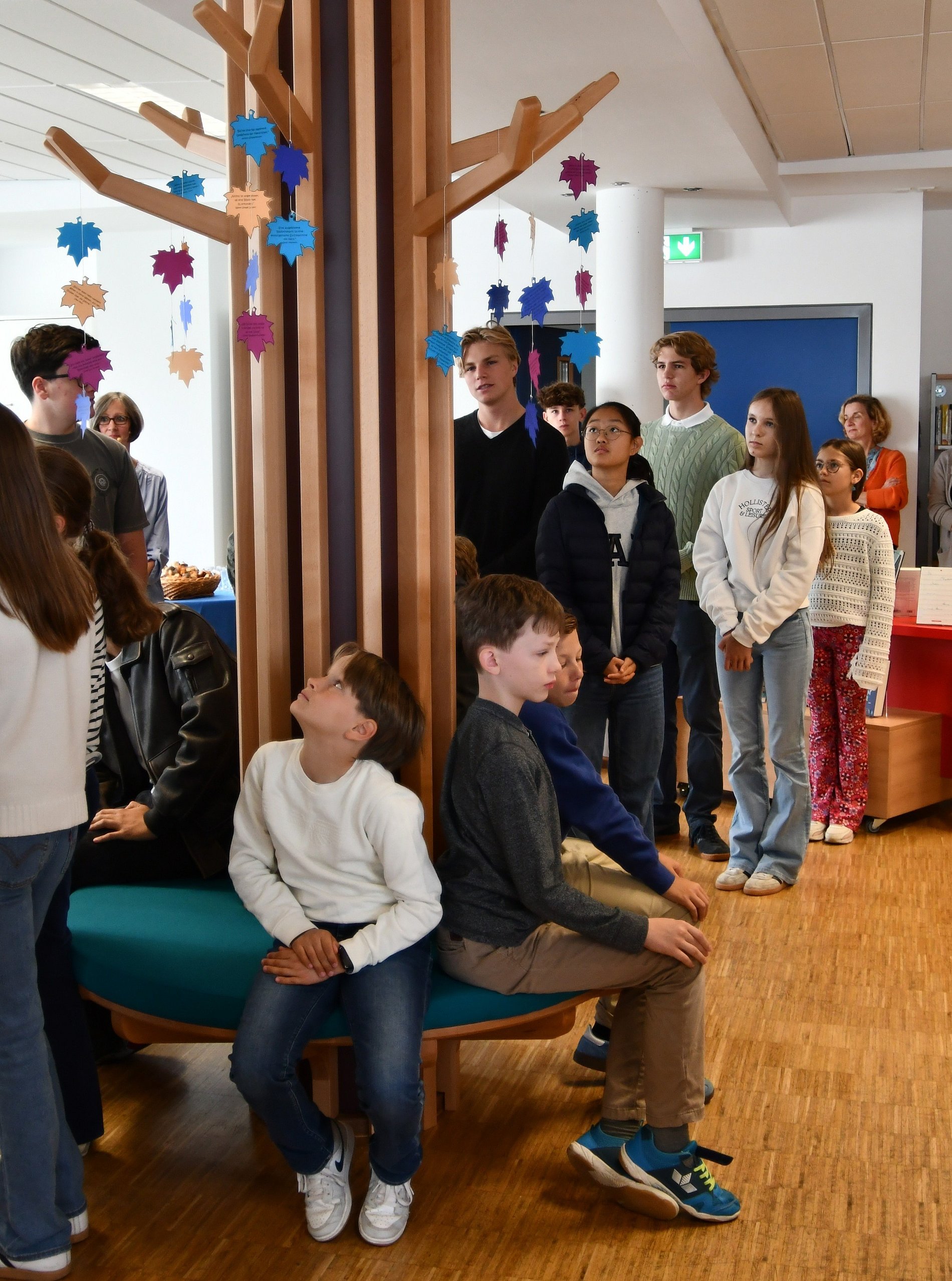 Kunstlehrerin Heike Wölfel und ihre Schülerinnen und Schüler hatten zur Feier des Tages 200 bunte Ahornblätter aus Tonpapier mit Zitaten aus der Welt der Bibliotheken und Bücher gestaltet. Ein Teil dieser kleinen Schmuckstücke zierte die Äste des Baumes, die restlichen Blätter erhielten die Gäste als kleine Erinnerung an die Bibliothekseinweihung.