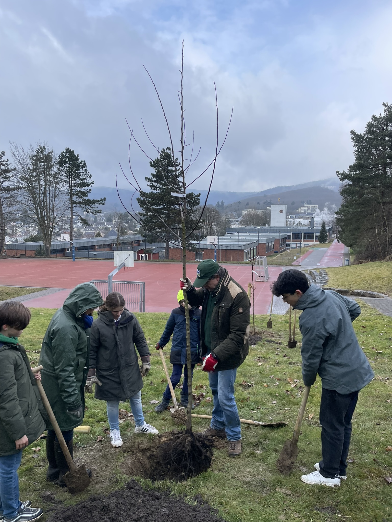 Um die Apfelernte für zukünftige Generationen an der Bischof-Neumann-Schule zu sichern, hat die Umwelt-AG bereits im vergangenen Winter fünf neue Apfelbäume gepflanzt. Dank der fachmännischen Unterstützung eines Profis, sind alle gut angewachsen und sollen in den nächsten Jahren wachsen und gedeihen, und viele Jahrzehnte Früchte tragen.
