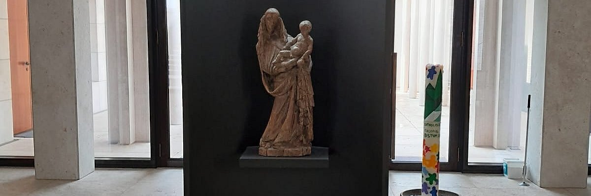 Im Rahmen eines begleitenden Kinderwortgottesdienstes hatten Pastoralreferentin Elke Peglow und ein Team vom Familienzentrum Doppelpunkt eine bunte Kerze mit dem Regionen-Logo gestaltet. Am Ende der Messe zogen die kleinen Gottesdienstbesucherinnen und Gottesdienstbesucher mit der Kerze in die Kirche St. Crutzen ein und schenkten sie dem Bischof, der sie mit nach Limburg nahm. Zur Freude aller hat sie nun einen Ehrenplatz im Bischofshaus gefunden.
