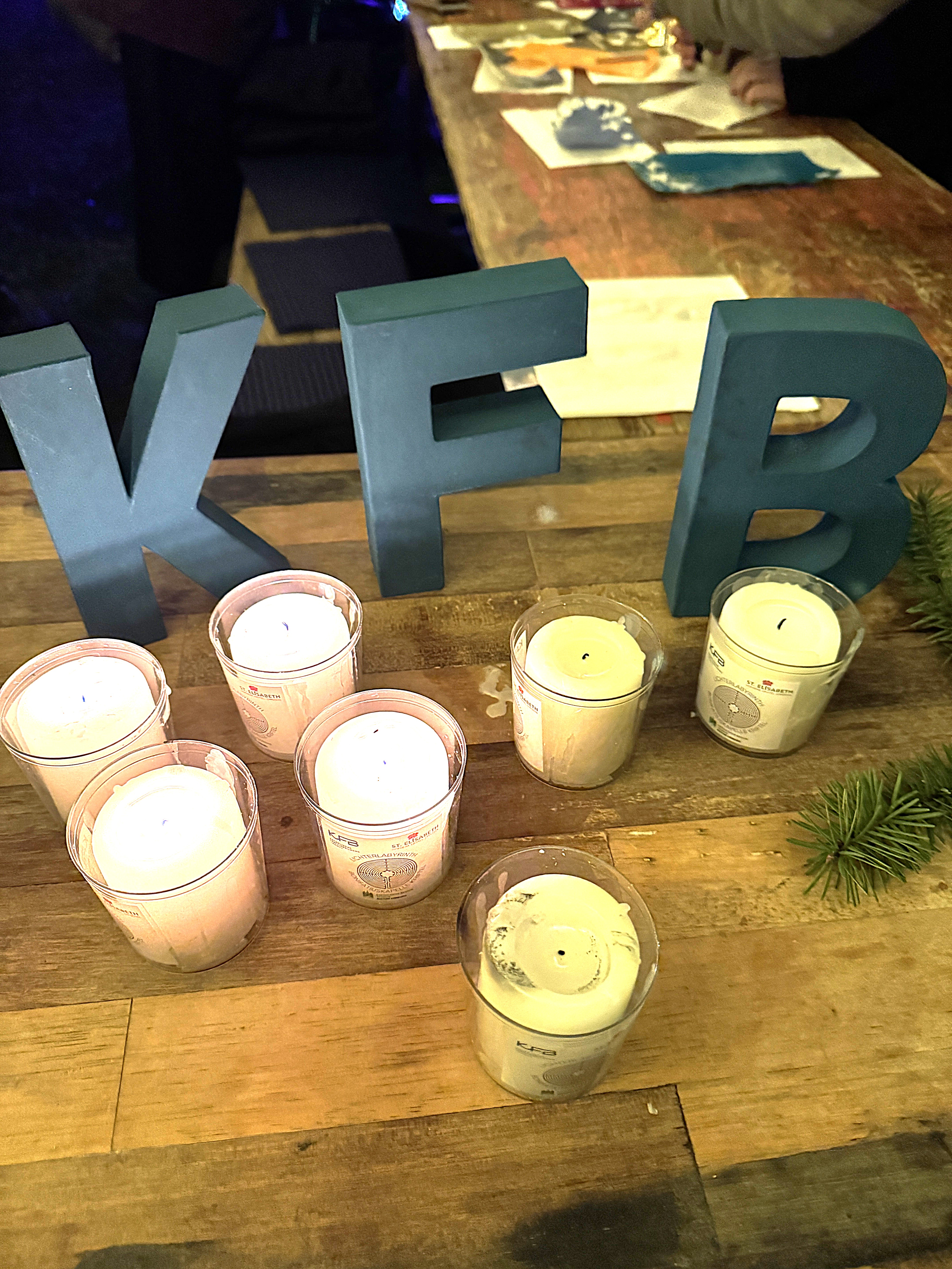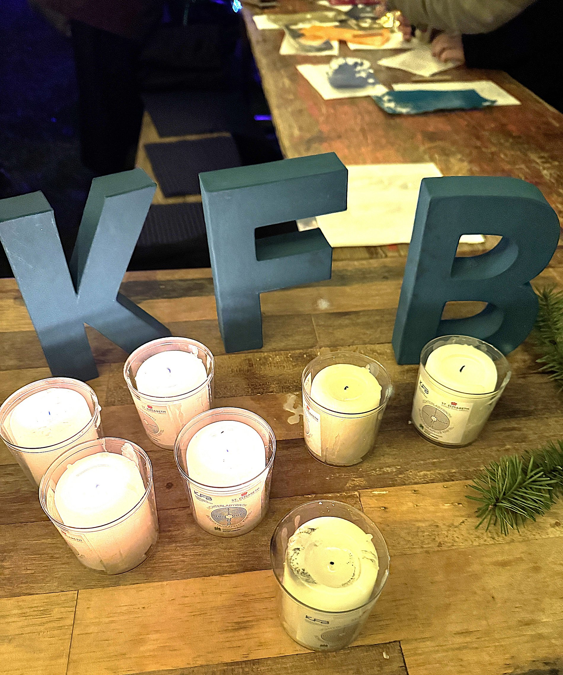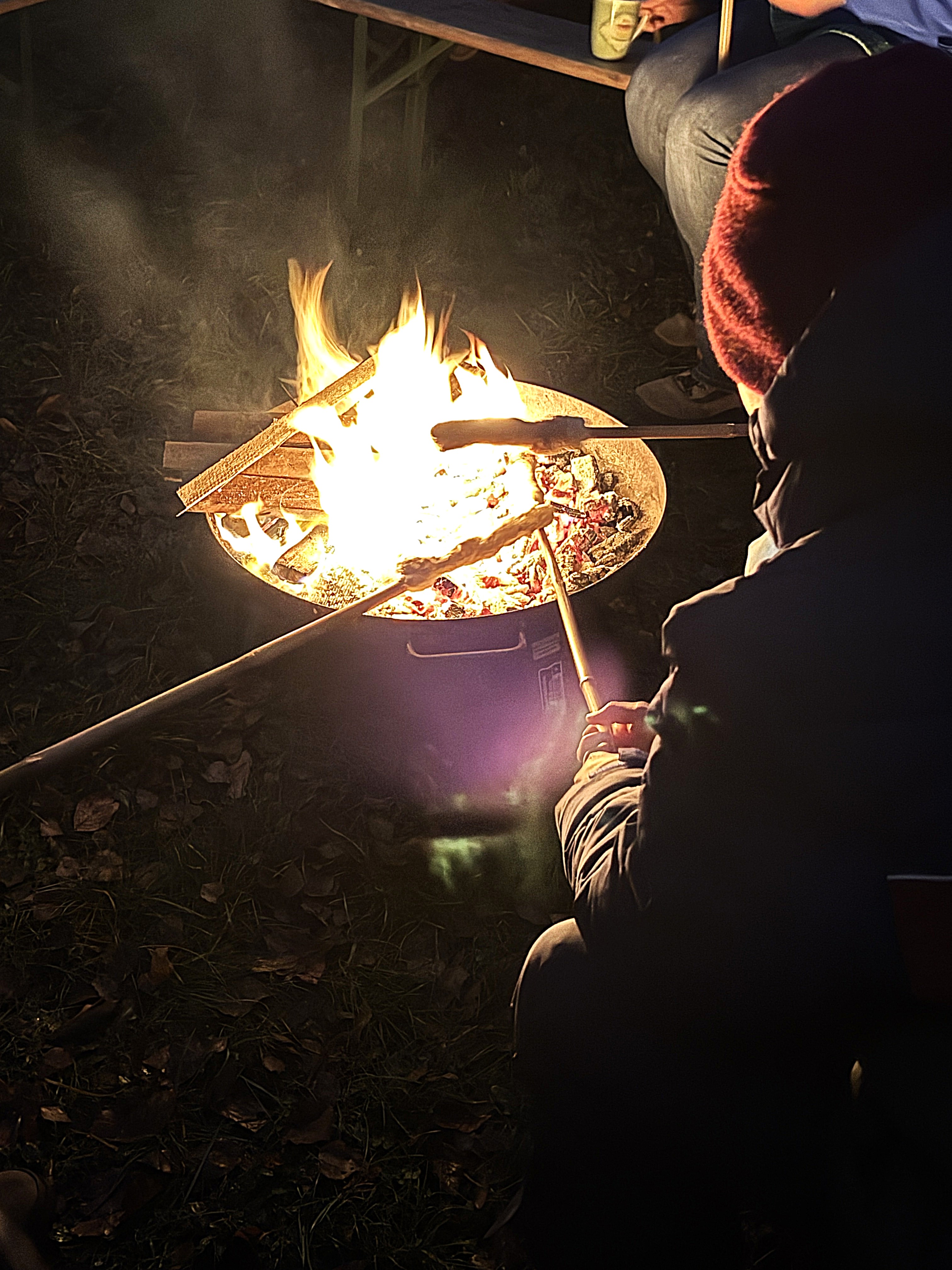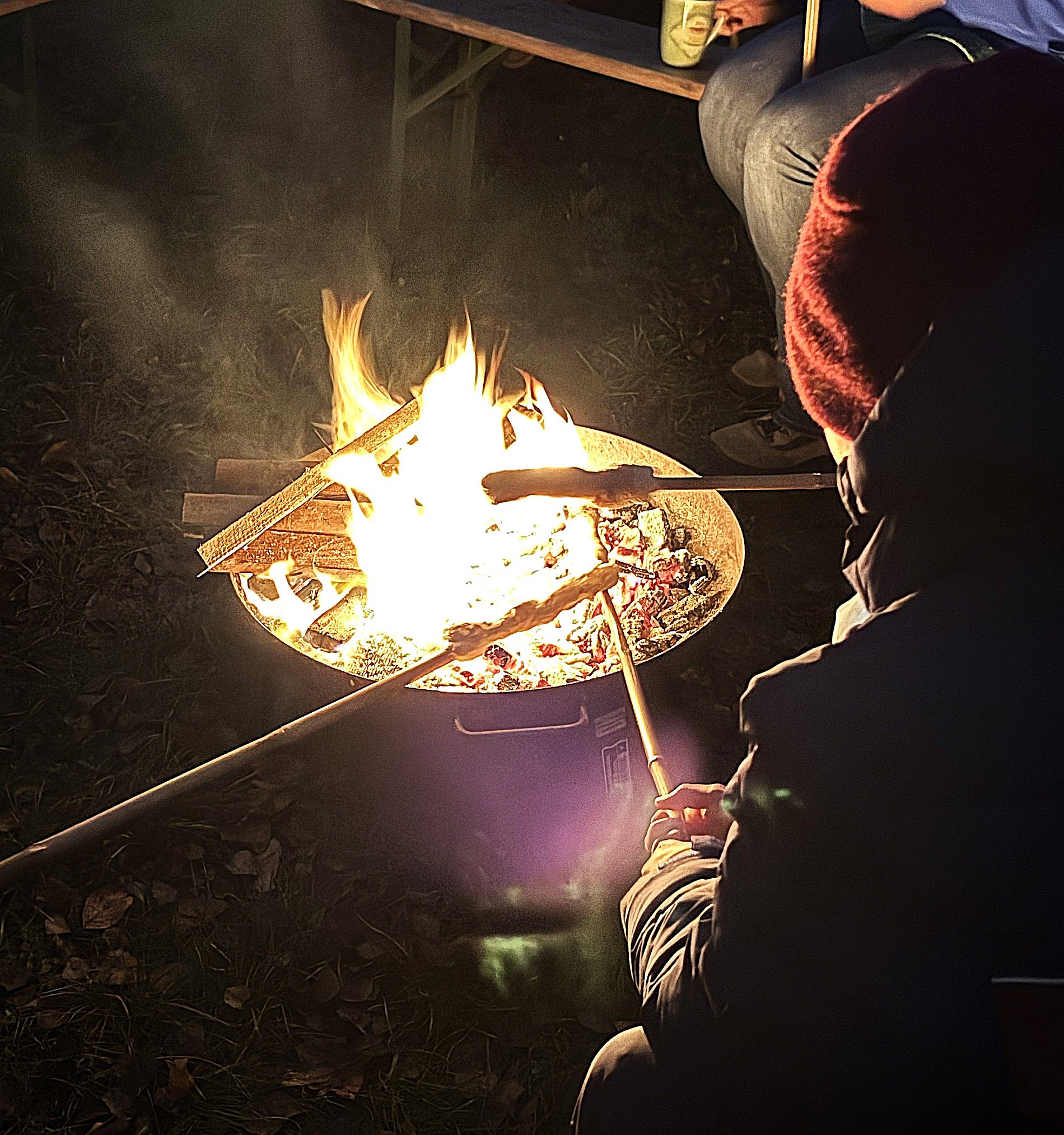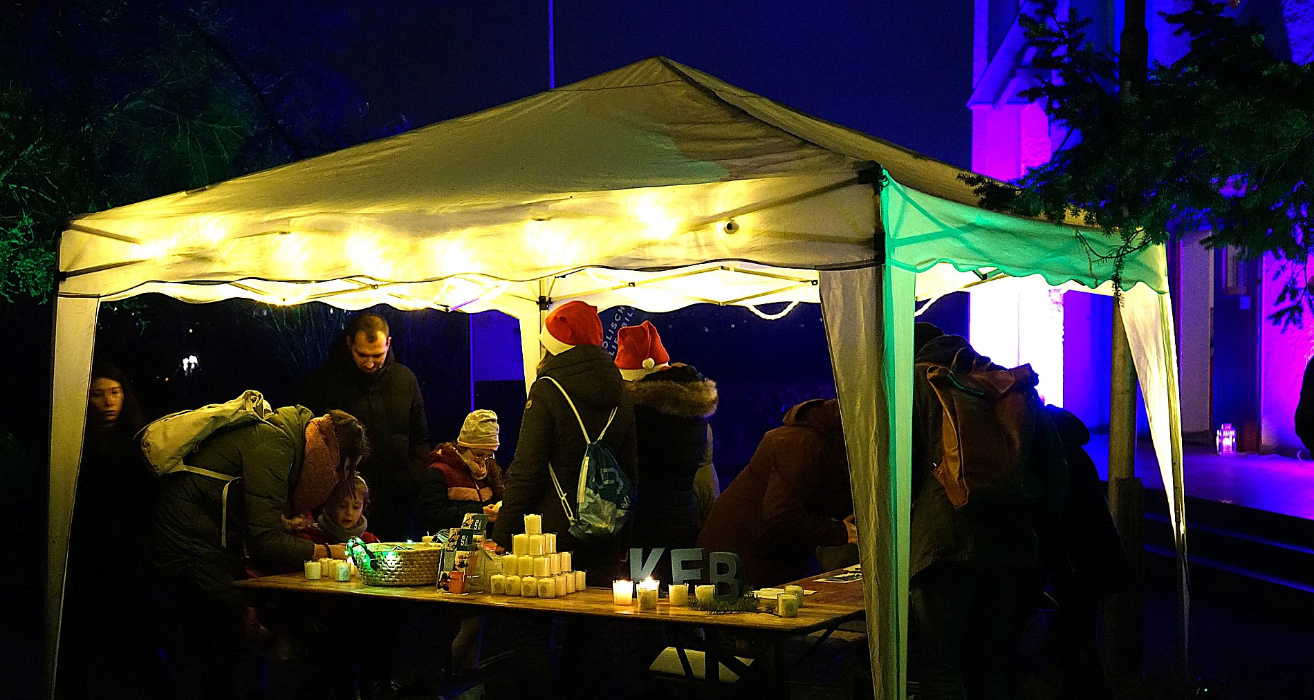 Doch es gab noch mehr zu erleben auf dem weitläufigen Gelände rund um die Bonifatiuskapelle. An zwei Lagerfeuern wurden Stockbrote über die Flammen gehalten, unter einem Zeltdach saßen viele gemütlich beisammen und wärmten sich mit heißen Getränken. Vor der stimmungsvoll illuminierten Kapelle hatte die Katholische Familienbildung Taunus (KFB) einen Stand aufgebaut. Dort konnten die, die das Friedenslicht mit heimnehmen wollten, nicht nur eine Kerze nehmen, sondern sie auch selbst gestalten. Wachsplatten und Werkzeug lagen aus, so dass man seiner Kreativität freien Lauf lassen konnte. Am Eingang des Geländes begrüßte René Kersting, Leiter der KFB Taunus, die Besuchenden und erklärte ihnen das Angebot. Besonders freute ihn, dass viele Familien zum ersten Mal im Gartenlabyrinth vorbeischauten.