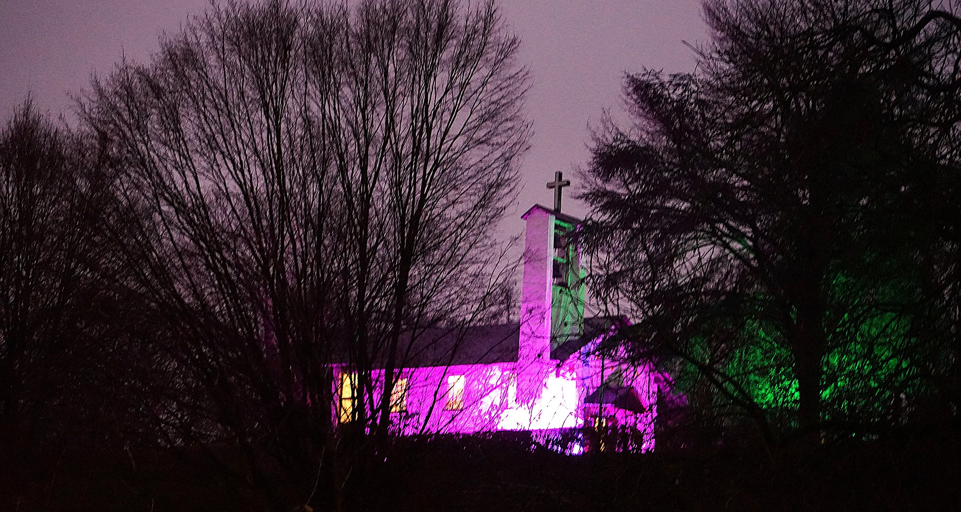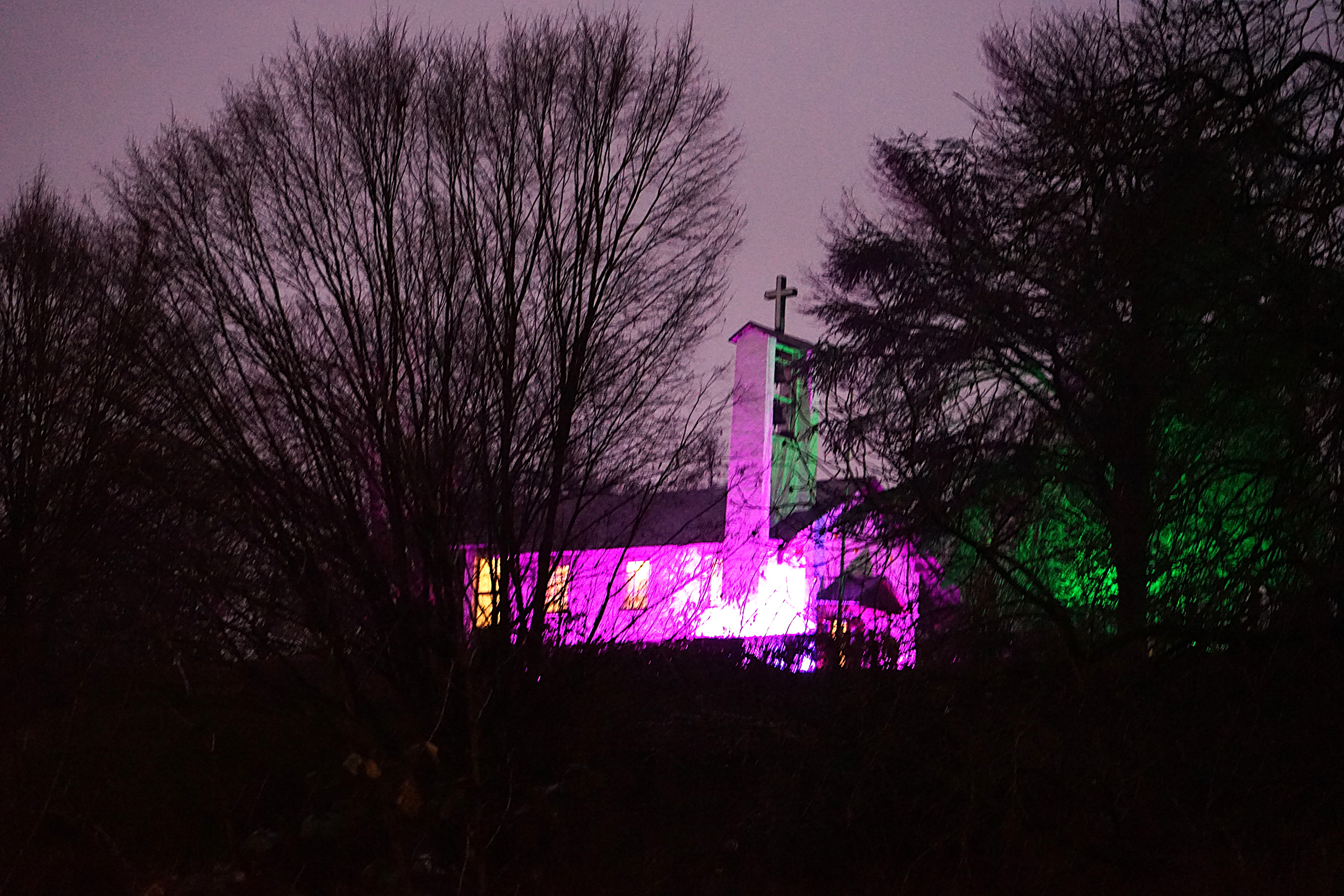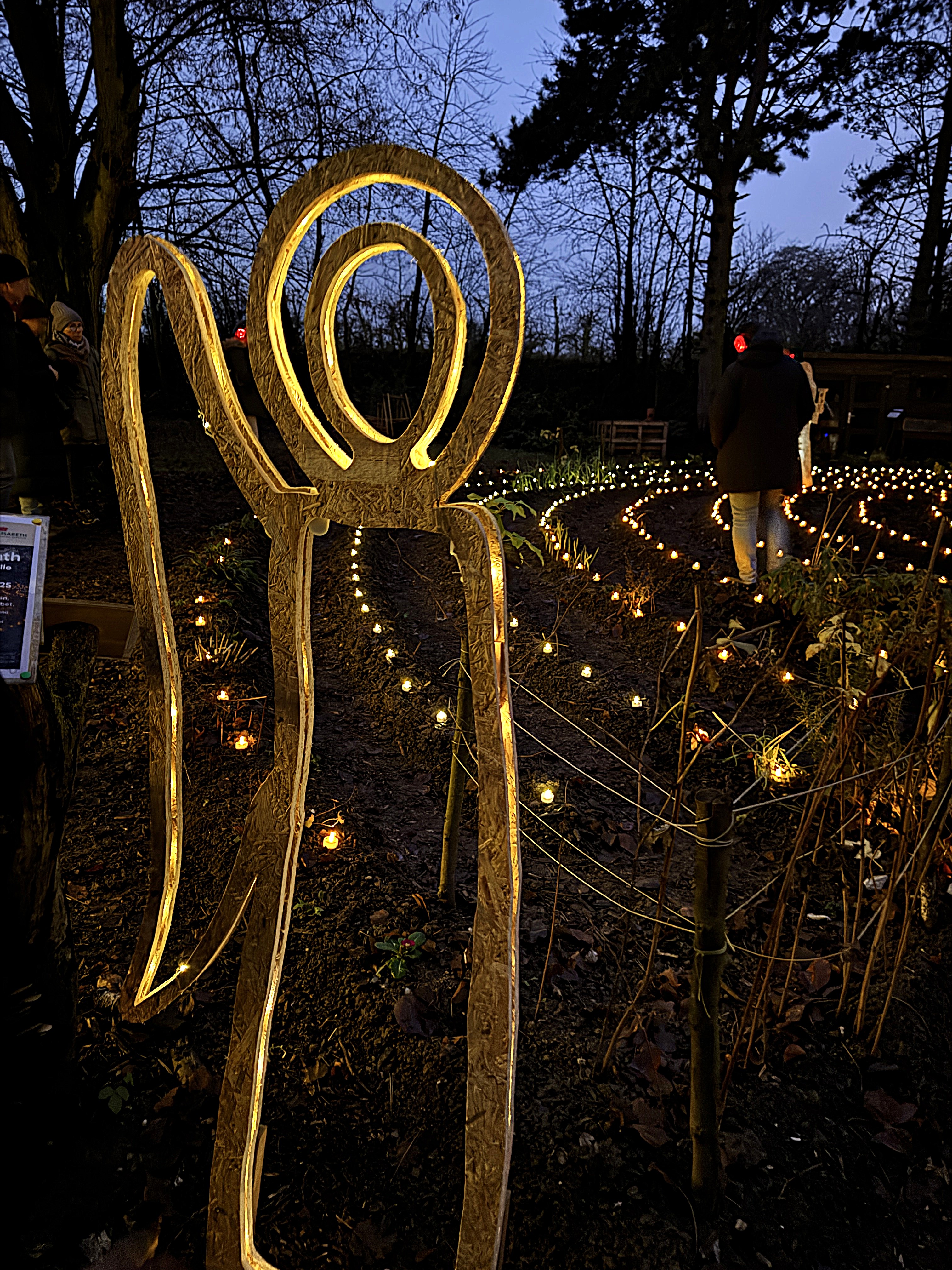 Im Lichterlabyrinth wurden neben den über tausend kleinen Lämpchen auch mehrere Heiligendarstellungen aus Holzschnitt aufgebaut. Eine 25-köpfige Pilgergruppe um Hans-Peter Labonte hatte nachmittags rund eine Stunde für den Aufbau gebraucht. Die Mühe hatte sich gelohnt, denn nun ging man auf dem beleuchteten Weg an der heiligen Barbara, dem heiligen Nikolaus und der heiligen Luzia vorbei. Auch begegneten den Besuchenden Figuren von Maria und Josef auf ihrem Weg nach Bethlehem. Zum Abschluss feierte Schwester Nathalie Korf CJ mit der Gemeinde noch eine Taizéandacht. Der Wunsch nach Frieden stand im Mittelpunkt des Gebets mit Gesang.