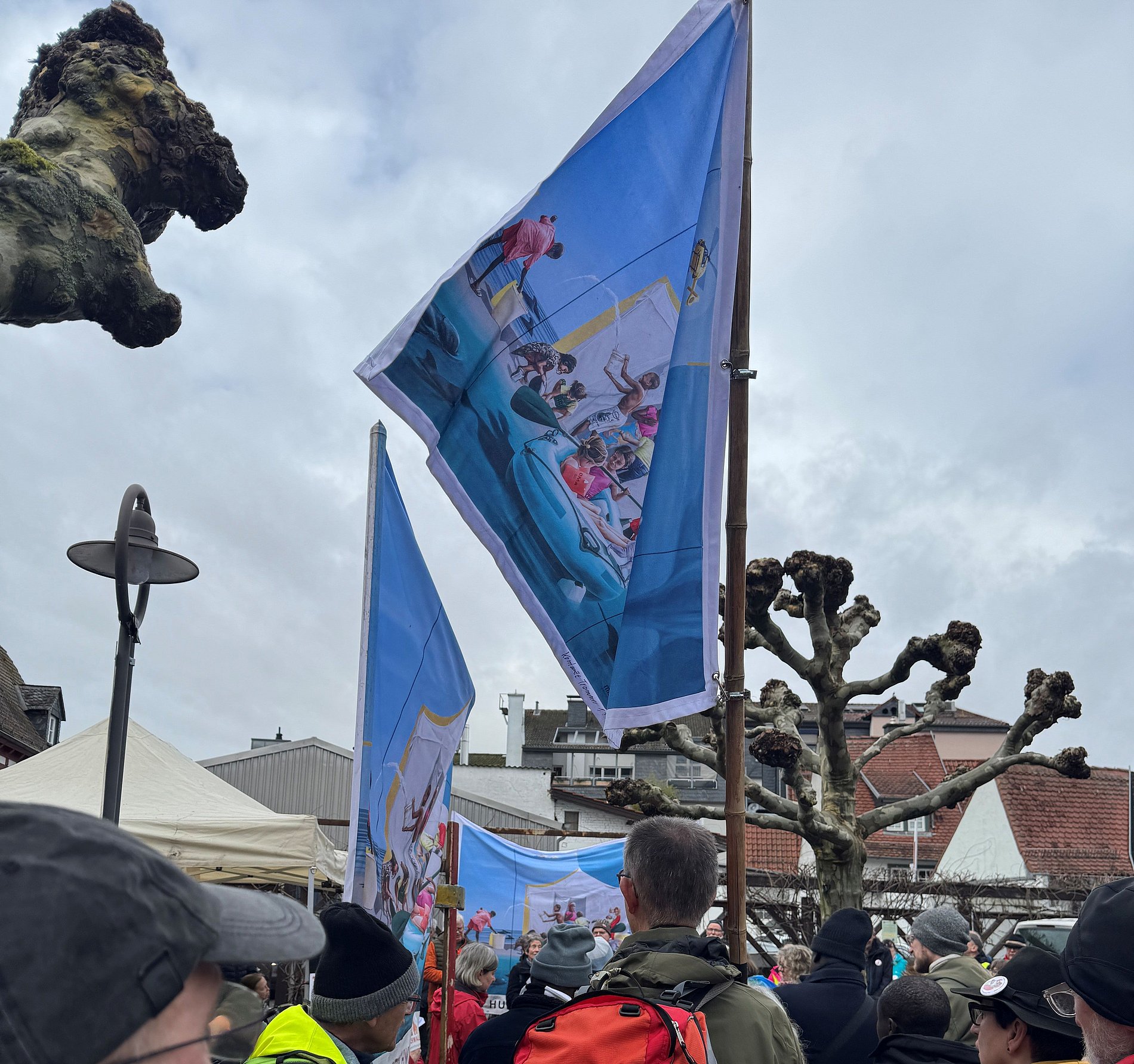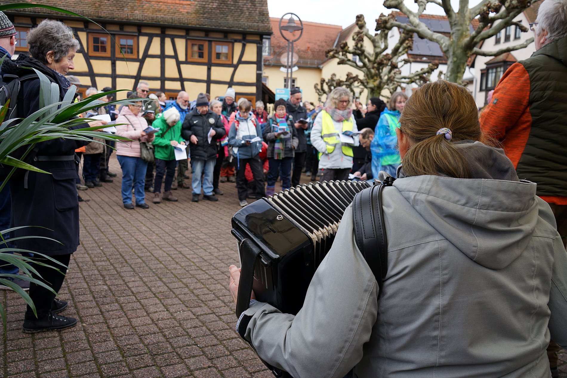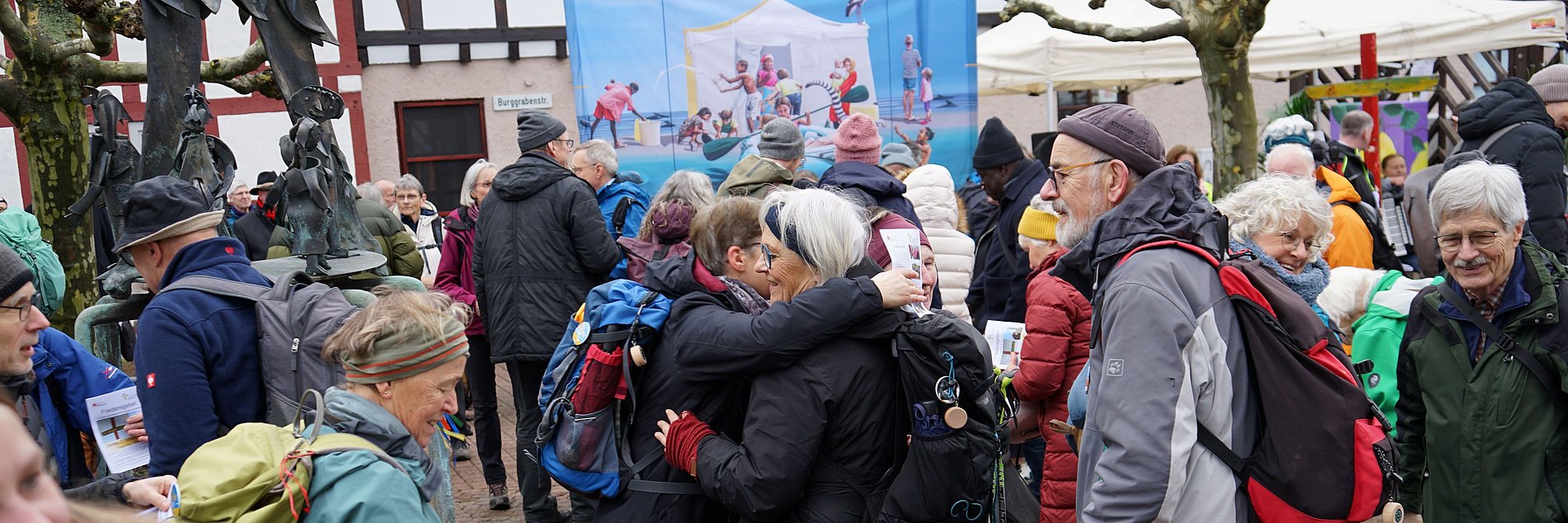 Als die Pilgerinnen und Pilger der Misereor-Hungertuchwallfahrt aus verschiedenen Richtungen am Samstagmorgen auf dem Hofheimer Tiverton-Platz einzogen, gab es Applaus für das Durchhaltevermögen der Wandernden, die teils Tagesetappen von 20 bis 25 Kilometern zurückgelegt hatten. „Den Weg nimmt man, wie er kommt“, sagte Bärbel Weber von der Paderborner Gruppe, die sich unter anderem durch starke Schneefälle kämpfen musste. Vor allem die Begegnungen in den Gemeinden hob sie als besonderes Highlight hervor. „Das trägt einen weiter!“