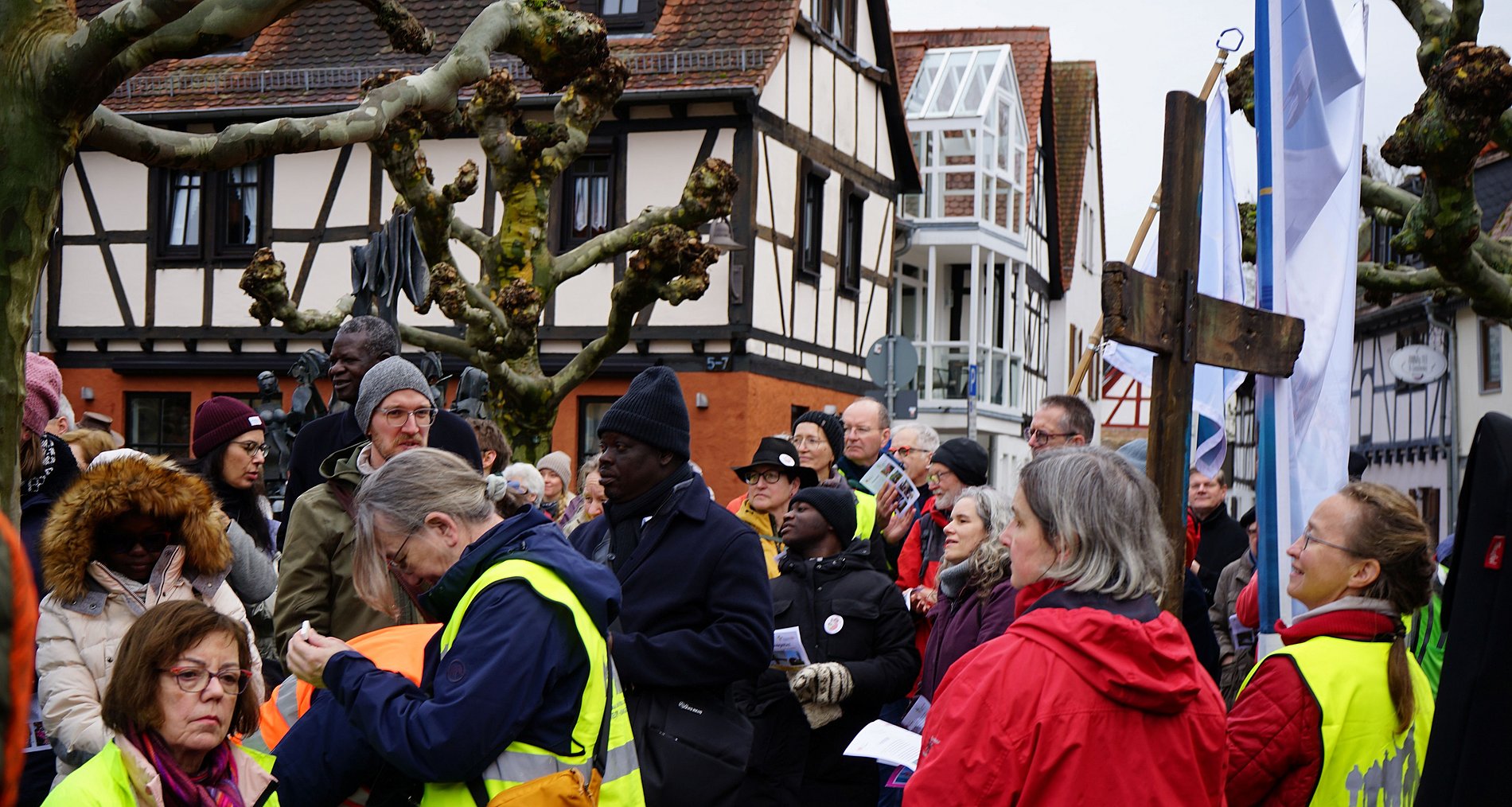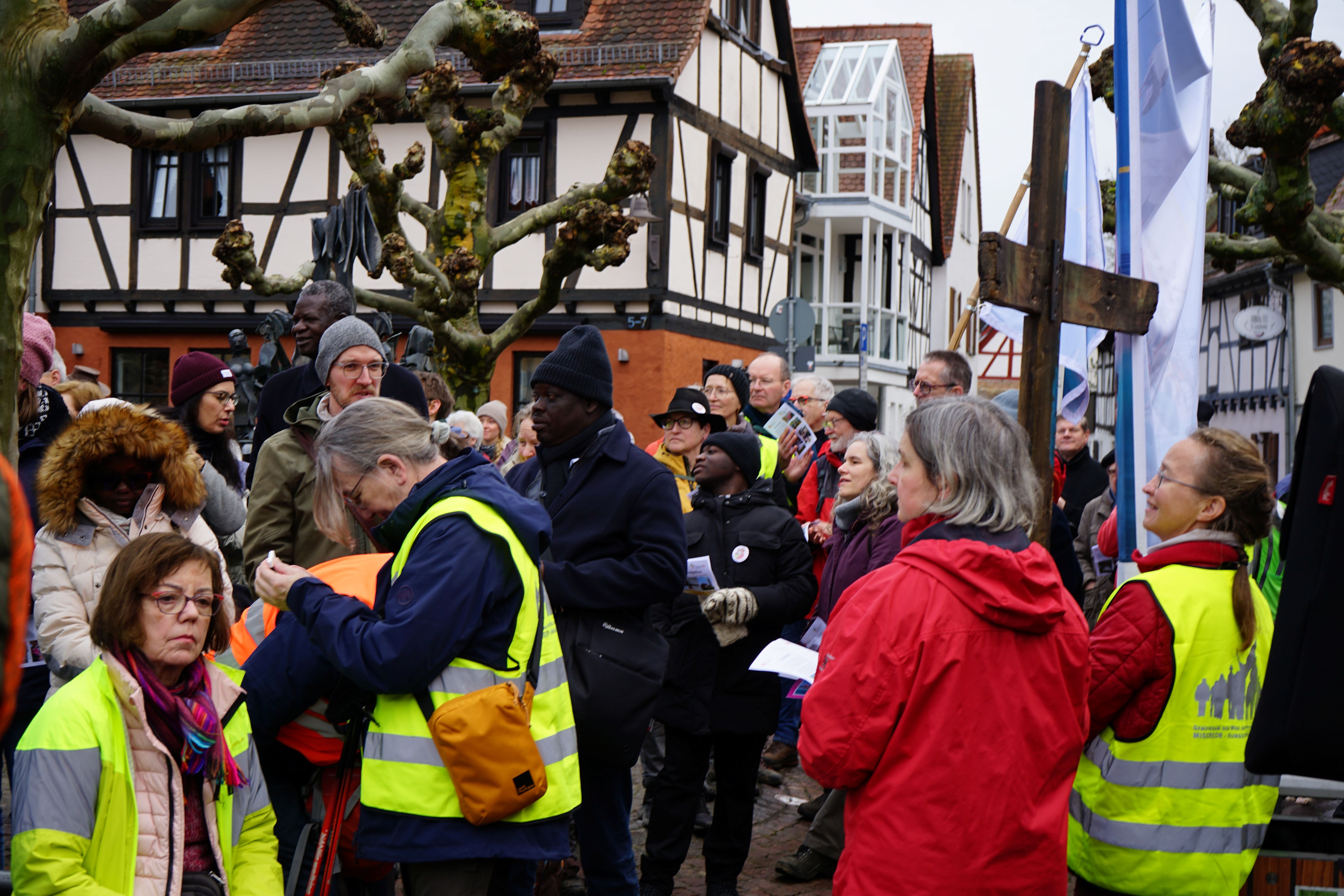 Auf dem Tiverton-Platz lud die AG Kamerun des Bistums Limburg zum Friedensgebet als Statio der Misereor Hungertuchwallfahrt ein. Die letzten Kilometer der Hungertuchwallfahrt legten die rund 120 Pilgernden dann gemeinsam zurück. Am Schwarzbach entlang zog die Wallfahrerschar im langen Zug nach St. Vitus Kriftel, wo der Freiburger Erzbischof Stephan Burger und Samuel Kleda, Erzbischof von Duoala, mit allen einen Wallfahrtsgottesdienst feierten.